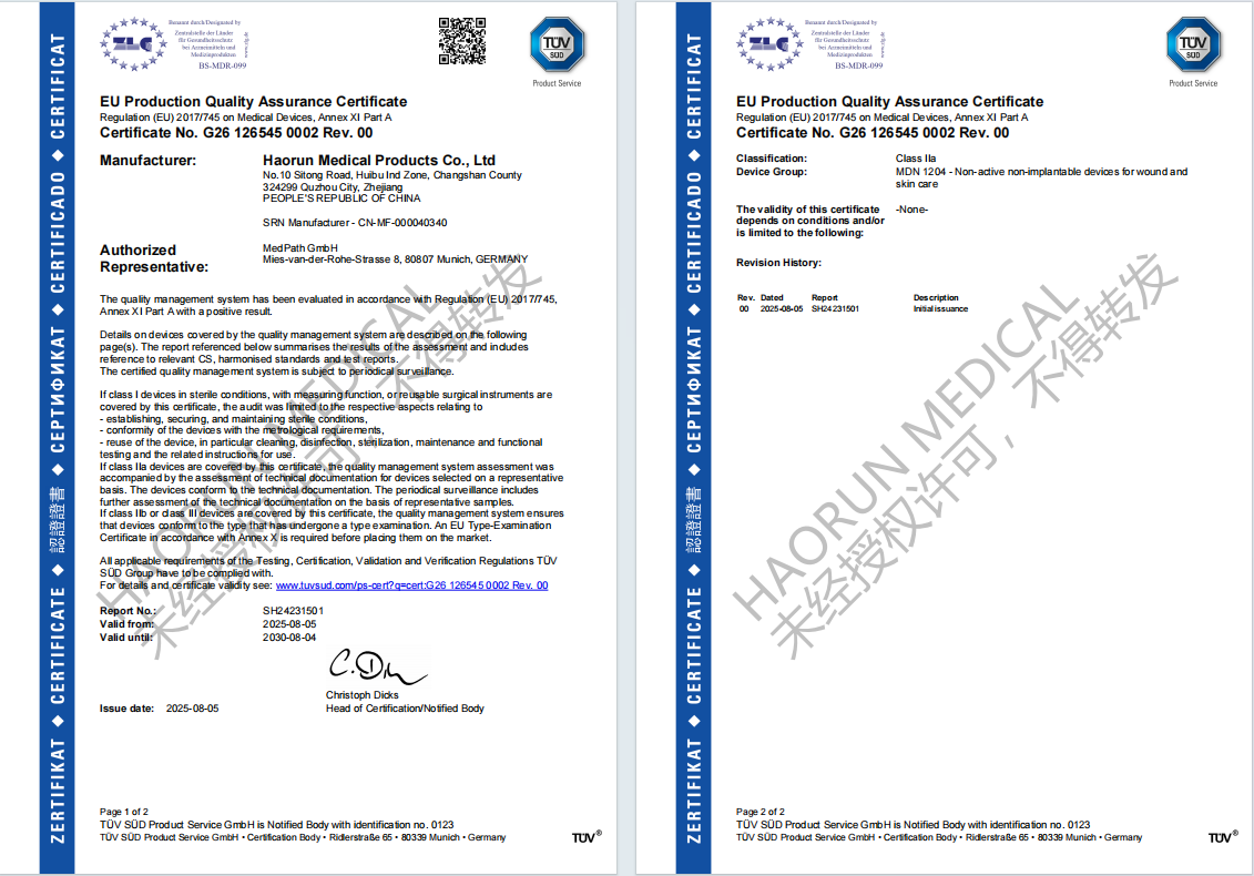 गुणवत्ता वाढविण्यासाठी, आम्ही सप्टेंबर २०२23 मध्ये आमच्या गुणवत्ता मॅन्युअल आणि प्रक्रियेच्या कागदपत्रांचे प्रकाशन पूर्ण केले. या आधारे आम्ही जानेवारी २०२24 मध्ये आमच्या गुणवत्ता व्यवस्थापन प्रणालीची कागदपत्रे एमडीआरशी संबंधित सामग्री जोडली. आम्ही 10 एप्रिल 2025 रोजी टीयूव्ही एसयूडी ऑडिटचा पहिला टप्पा आणि नंतर दुसरा टप्पा पार केला. अखेरीस, या वर्षाच्या ऑगस्टमध्ये, आमचा प्रमाणपत्र क्रमांक अधिसूचित बॉडीच्या प्रणालीमध्ये पाहण्यासाठी उपलब्ध झाला, हॉरन मेडिकलच्या गुणवत्ता व्यवस्थापन प्रणालीमध्ये एक नवीन पाऊल पुढे आणि कंपनीच्या विकासासाठी कंपनीचा पाया मजबूत करण्यासाठी. आमचे डिस्पोजेबल मेडिकल उपभोग्य वस्तू (गॉझ, गॉझ रोल, कापसाचे किंवा रेशमाचे तलम पारदर्शक कापड, इ.) जगभरातील ग्राहकांना उत्कृष्ट उत्पादनाची गुणवत्ता आणि सेवा प्रदान करतात.